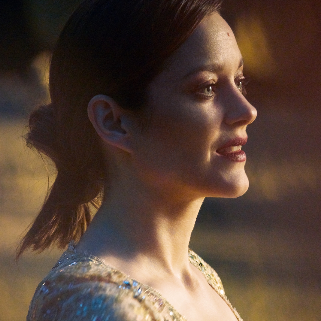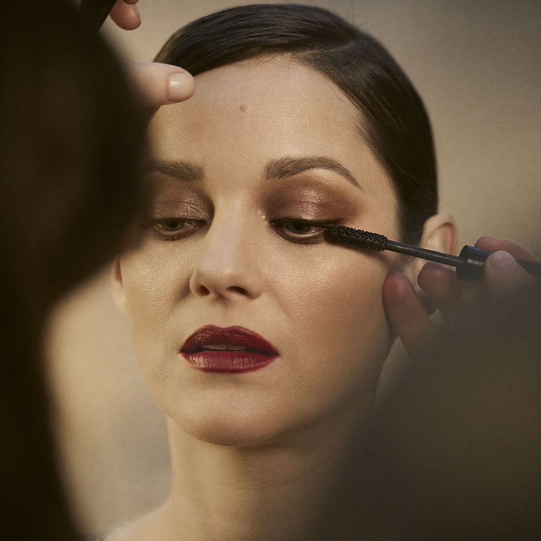 Für das Make-up von Marion Cotillard hat Lucia Pica sich entschieden, dem Blick mit Hell-Dunkel-Nuancen Tiefe zu verleihen und die Lippen in einem intensiven Samtrot erstrahlen zu lassen.